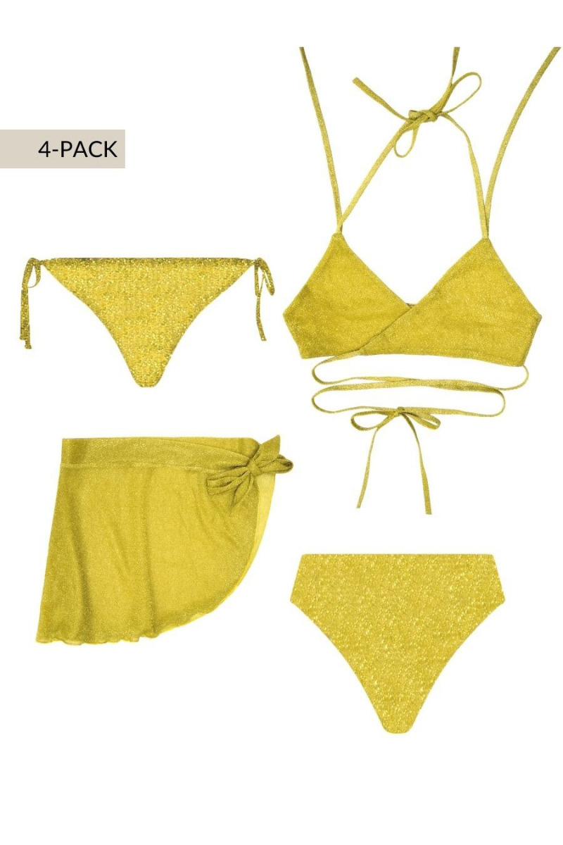 The Kyana Bikini Set Lime is a beautiful bikini set, especially if you want to switch it up! T he set is a 4 pack made of a nice shiney lurex fabric. It has a bikini top with straps (and a removable padding), a brazilian bikini bottom, a high waist bo