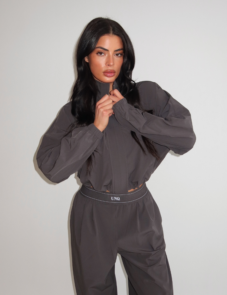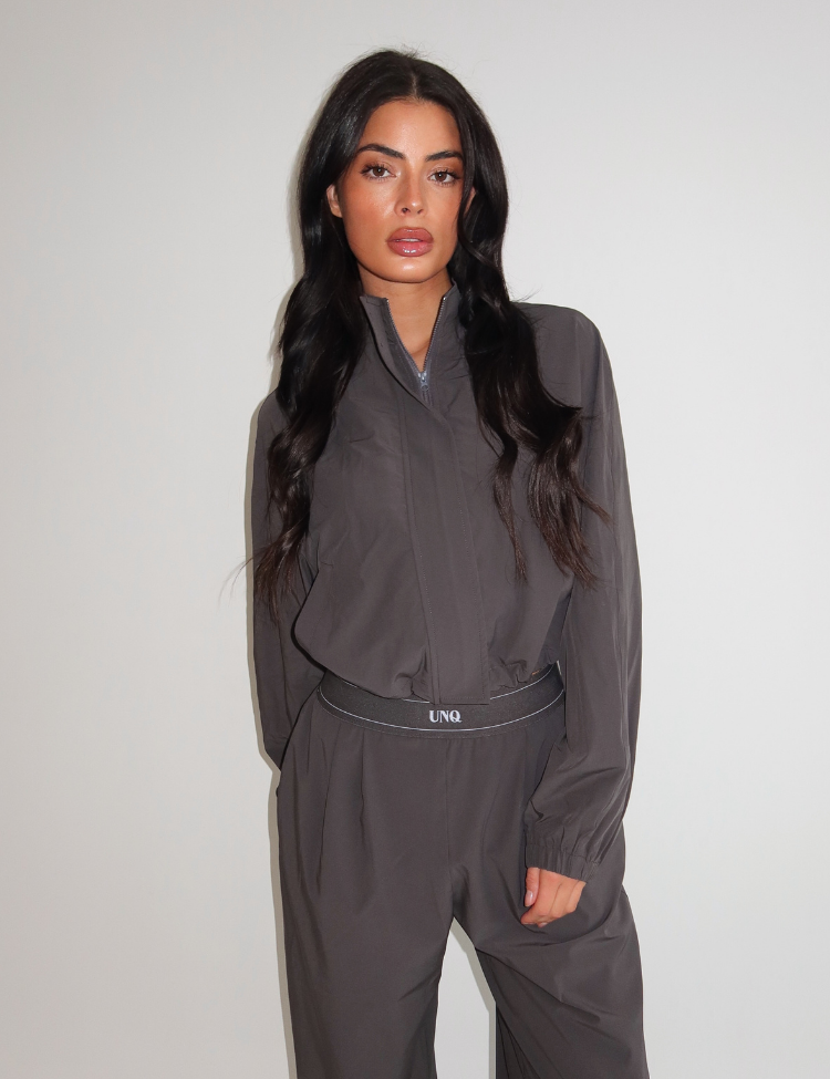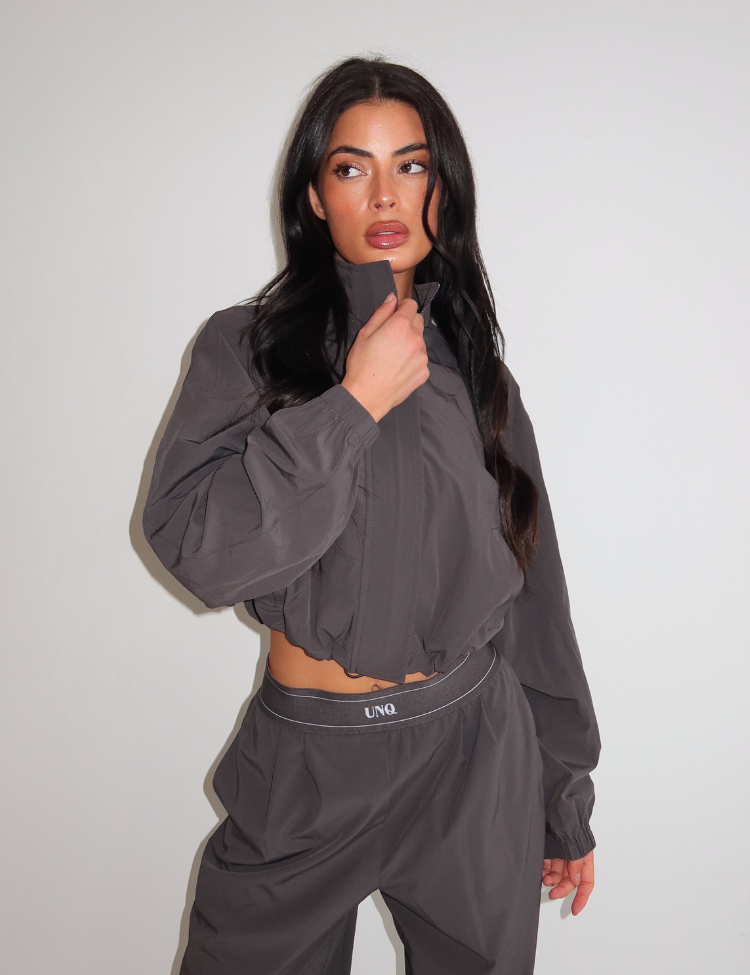 The Gigi Jacket Charcoal by Unique The Label is a cropped zip-up piece with sporty vibes and elevated details. Designed with elastic cuffs, a high collar and a clean logo, this jacket completes your streetstyle or lounge look with ease.