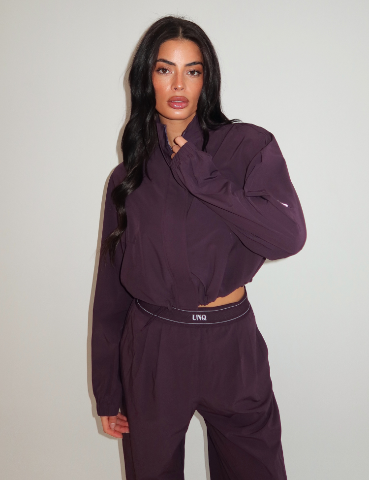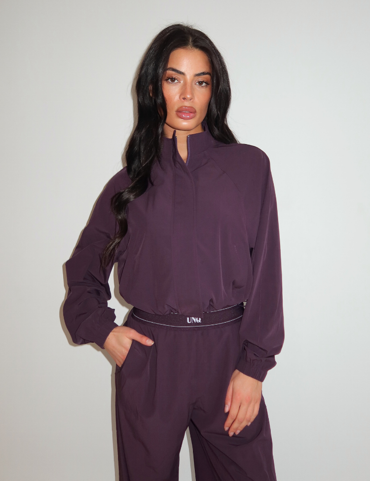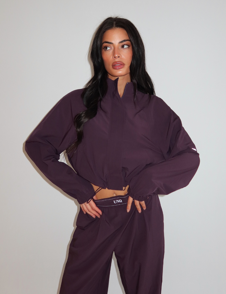 The Gigi Jacket Deep Berry by Unique The Label is a cropped zip-up piece with sporty vibes and elevated details. Designed with elastic cuffs, a high collar and a clean logo, this jacket completes your streetstyle or lounge look with ease.