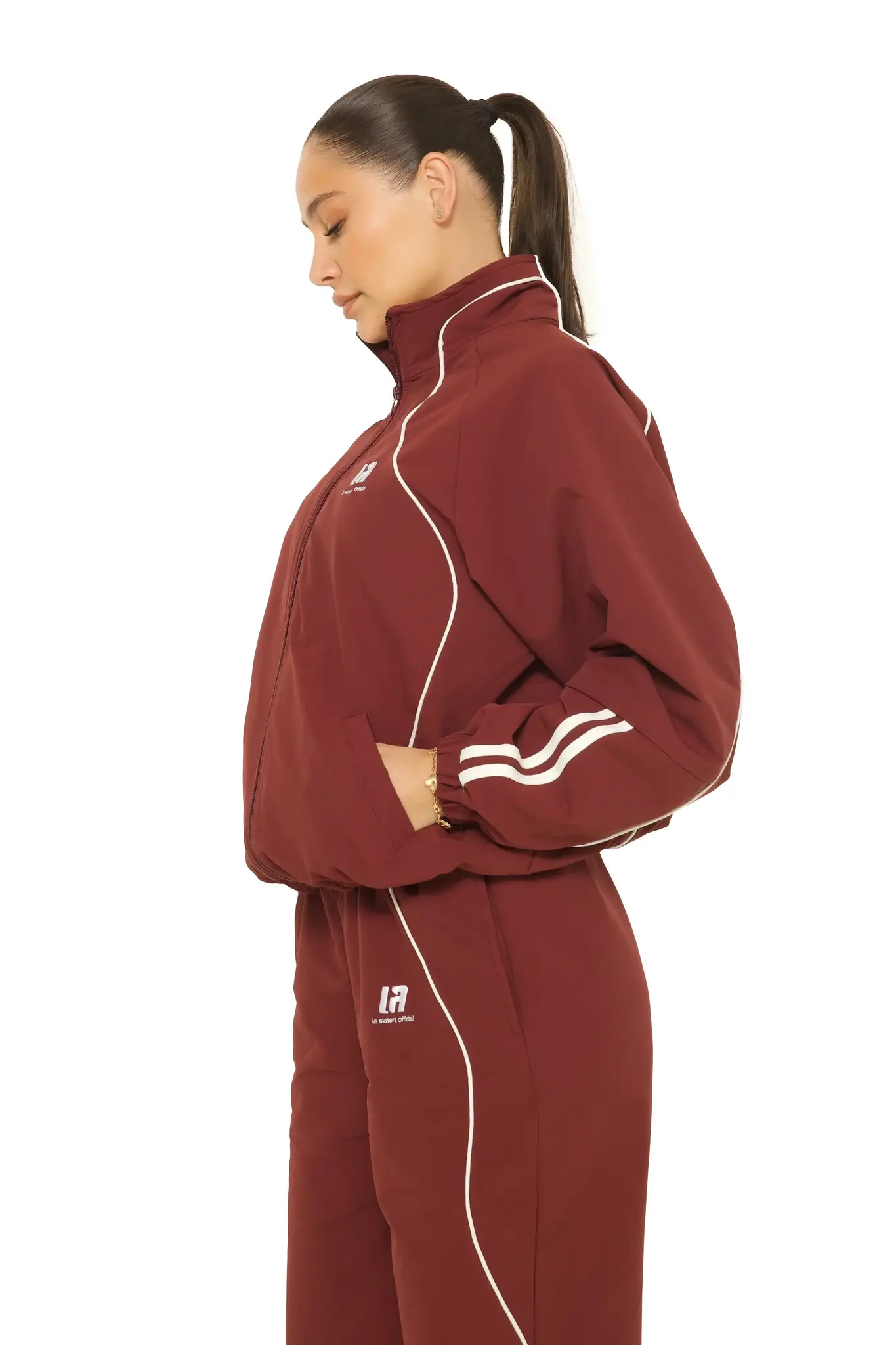 The LA Sisters LA Official Zip Up Jacket Burgundy is not your average piece, this is a statement piece with attitude. Its sporty aesthetic, inspired by classic track jackets, instantly delivers that recognizable LA Sisters street energy. The relaxed fit and soft fabric provide comfort, but it is the bold presence that truly makes this piece stand out. The logo detailing and strong design lines create a confident, almost retro sport vibe while still feeling modern and current. This is the jacket you wear when your outfit is meant to be seen. Pair it with the matching pants for a full statement set, style with sneakers and a cap for an edgy street look, or contrast it with a fitted top for a sharp feminine balance. This is not a safe choice, this is character in clothing form. Available exclusively at Eve’s Fashion.