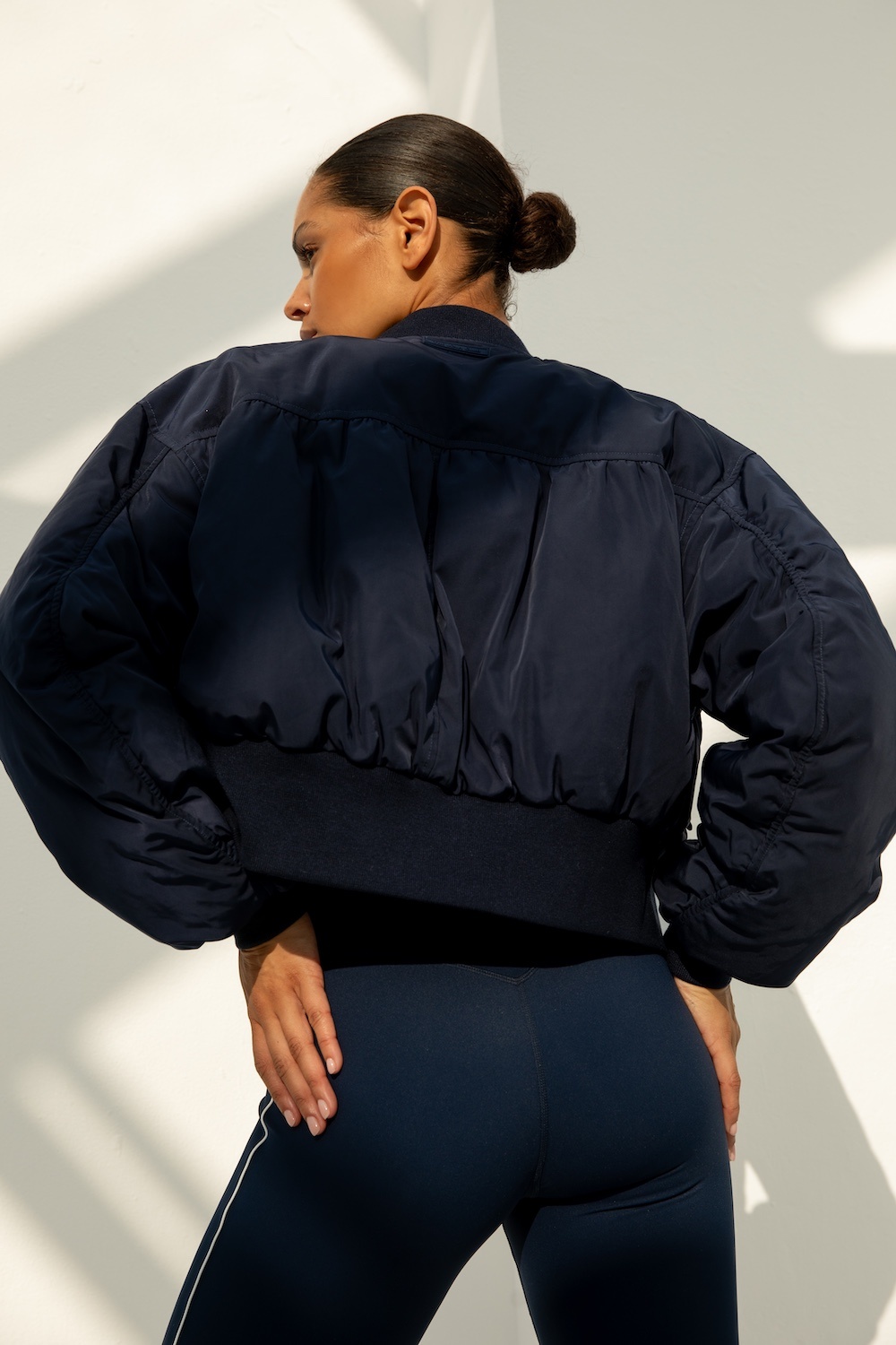 The Leah Bomber Navy by The Lola Club adds instant coolness to any outfit. This lightweight bomber blends a modern streetwear vibe with a feminine touch. Perfect to throw over a sporty set or a sleek dress. Wear it open with a tank top and trousers for a city-chic feel, or pair it with the Demi Legging & Top and sneakers for a laid-back vibe. Whether you’re heading to work, a festival or a weekend getaway, the Leah Bomber completes your look. The Leah Bomber Navy is sporty, stylish and the ultimate finishing touch to your outfit – the piece that completes the Lola look. Available at Eve’s Fashion.