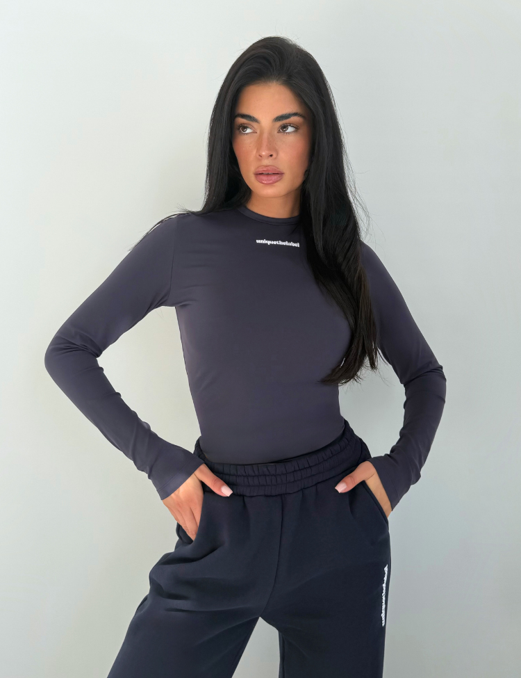 The Robyn Longsleeve Top Navy by Unique The Label is the must-have fitted top that brings sporty elegance to your everyday look. With a high round neckline and smooth, stretchy fabric, this top hugs your figure comfortably and feels like a second skin.