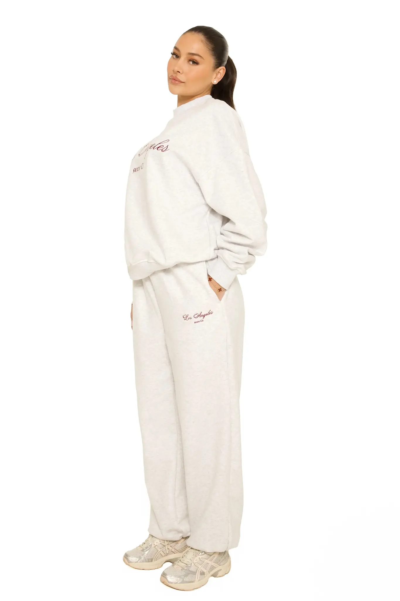 The LA Sisters The Hills Sweatpants in Burgundy defines modern casual luxury. The soft, high-quality fabric feels comfortable against the skin, while the relaxed fit creates an effortless silhouette. Subtle LA Sisters embroidery in a contrasting shade on the leg adds a refined brand detail that elevates the design. Ribbed ankle cuffs add structure, giving the jogger a clean and contemporary finish. This piece moves naturally with your day. From a calm morning with coffee or matcha to lunch in the city, these sweatpants remain polished without trying too hard. Pair with the matching crewneck for a tonal set or wear with a fitted top and oversized blazer for a modern city look where comfort and style meet. Available through Eve’s Fashion.
